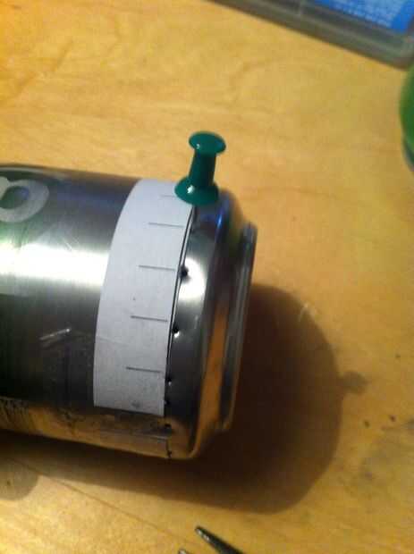 Envuelva la plantilla de papel alrededor de la lata dejando un espacio entre los extremos, el borde del papel debe colocarse 5mm del borde para que los agujeros de perno sentarse al lado, esto permite que un bote para colocarse directamente sobre la estufa. Empiece en la brecha y hacer un agujero en el centro de la brecha y alrededor como se muestra en la imagen.