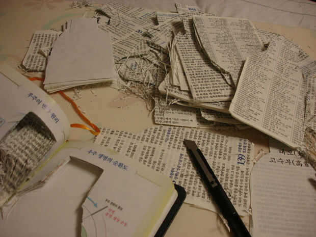 Las páginas de la Biblia son particularmente delgadas. Hubiera sido mejor para mantenerlos todos apilados y para mantener el corte, pero las antiguas páginas consiguieron en el camino haciendo pasadas de cuchillo limpio.
