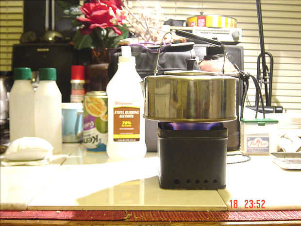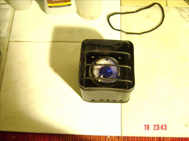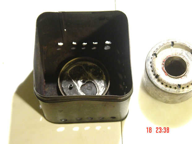 Con un par de latas de refresco, corte las secciones de la parte inferior de cada uno. Aluminio de lata de soda es tan delgada que puede cortar con unas tijeras. Dejando una soda puede inferior como para la parte inferior de la mitad de mi tanque de combustible / quemador. Es preferida para hacer la perforación de la parte superior de la unidad de la hornilla antes de cortar la parte inferior de la lata. La otra sección de soda puede inferior es agujero de Sierra de corte en el centro de la depresión o concavidad de la lata. En segundo lugar, la transferencia de un patrón hexagonal ray sobre el borde de la lata de soda en trabajo (esta soda puede fondo voluntad de convertirse en la parte superior y trabajar el quemador de la estufa). En las marcas transferidas, utilice un archivo oval (e archivo de un joyero) y archivo seis agujeros ovalados. Utilizando otra plantilla: transferir el patrón para la pequeña ronda los agujeros para el quemador de la mitad de la estufa. Utilizando una herramienta de poco en mi Dremel (o cualquier taladro ligero con cable o inalámbrico) taladro de 1/16", perforar cinco por seis espacios entre los agujeros ovalados que presenté antes. Eso me da un total de 30 agujeros. Estos son los jets para las llamas de la estufa. La sección inferior que queda Virgen obtiene sus paredes ligeramente aplastados. La parte superior, ya perforada, obtiene un disco de malla (malla # 100) de latón preparados puede sección corte para caber el interior de la soda. Un pedazo de lana de vidrio es insertado en la sección inferior del quemador. A la sección de prensado, Aplique sellador de silicona de alta temperatura (el tipo usado para bloques de motor de gas, tipo RTV) alrededor de su circunferencia y esta sección de la parte inferior dentro de la parte superior no prensada, hasta tanto no pueden ser exprimidos más. Con el dedo índice en el agujero vio agujero de corte, apriete la prensa de la sección inferior de sección contra la pared de la exterior (y también la parte superior) para lograr un sello hermético. Esto es importante, porque quiere evitar las fugas de combustible desde la articulación de ambas partes. Especial cuidado debe tenerse al realizar el apriete de las paredes del prensado para evitar cortes en el dedo (s). Luego se corta una tira del mismo material de aluminio de los refrescos latas usted ha estado usando para fabricar el embudo fijo para la estufa. Mida desde la parte superior del agujero grande (en el centro de la parte del quemador) en la parte inferior del quemador, añadir from3/32 "a 1/4", se trata de la anchura de la tira de aluminio que te corte, laminación e insertando en el agujero del embudo para que se ajuste. El exceso de la tira de embudo no debe ser mayor 3/32" por encima del borde del orificio del embudo. Una vez que el ajuste final, hacer tres cortes en forma de "v" al final del tubo del embudo, esto será el borde inferior de la misma, en el orificio del embudo y aplicar silicona para sellar la junta entre el orificio del embudo y el tubo del embudo. Poner este montaje a un lado durante las 24 horas para permitir que el silicio RTV curar. Esto se llama quemador. El siguiente es la caja de la lata para ser modificado para convertirse en la cubierta de la estufa, apropiado. Usando una caja de la lata mide 4 "X 4" X 4 "taladro distribuido 1/4" agujeros alogside la parte inferior de la caja de la lata. Centrado de la parte inferior de la caja de la lata sana, lugar puede la parte superior o tapa removida de una gaseosa, que se utilizó para fabricar la hornilla, la raja con un cuchillo las paredes de aluminio atado y con guantes de cuero y usando un par de pinzas, pell de paredes de aluminio (o piel) de la tapa superior de la soda puede. p; as esto tapa ont centrado dentro de la parte inferior de la caja de la lata. La marca de dos orificios a taladrar la tapa como cerca del centro de la tapa como sea posible. Taladro usando 1/8 broca y coloque la tapa perforada en la parte inferior interior de la caja de la lata. Marcar primero un agujero en la parte inferior de la caja de la lata y con 1/8 broca de taladro. Coloque la tapa previamente perforada en la parte inferior de la caja de la lata con un remache "pop" de 1/8" X3/16" largo. Compruebe antes de clavar, que la tapa está correctamente centrada en la parte inferior de la caja de la lata. Garantizar este remache. Ahora le taladre el segundo agujero en la parte inferior de la caja de la lata siguiendo el orificio previamente perforado en la tapa que no ha sido clavada aún. Entonces asegure la tapa en su segundo agujero a la caja de la lata. Un recordatorio, empuje los remaches desde el exterior hacia el interior de la caja de la lata. El viene de la rejilla, para apoyar la olla para cocinar... Con un trozo de rejilla de horno, mida la altura y la anchura de la caja de la lata. Multiplicar 2 veces la altura de la caja de la lata y añadir la anchura, además de tres pulgadas. Esto le dará las dimensiones ásperas para la parrilla de la estufa. Centro de la anchura de la pieza de rejilla para trabajar on.and curva para conseguir una parrilla libre. Corte y recorte hasta llegar a una rejilla que es 3/4" por encima del borde superior de la caja de la lata. Recuerde que su parrilla tiene cuatro patas y puede verse como un insecto de otro planeta pero lo hará su trabajo mientras se mantenga el ajuste incluso para las cuatro patas. Ahora esto es para la fabricación de esta estufa del alcohol. Vamos a probarlo. Después de la curación ha sido completa para el silicio RTV, vierta ethyl alcohol (alcohol al 70%, que similar a lo que se obtiene en una farmacia o ferretería) hasta que vea un desbordamiento leve del tubo del embudo y concavidad de la sección superior es en alcohol. Cubra la botella de alcohol y ponerlo lejos, alt por lo menos cinco pies de distancia de seguridad. Coloque el quemador en la caja de la lata el quemador en la tapa del asiento. Coloque la rejilla en la 