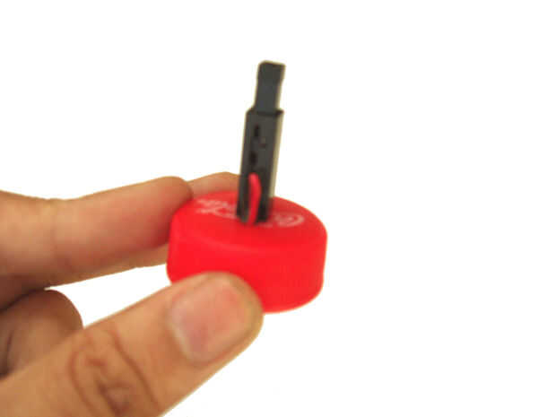 Consigue su segunda tapa de la botella con la tapa de dos agujeros. Inserte la parte metálica inferior del encendedor primero Introduzca el alambre en el orificio más pequeño. Fije el conjunto con pegamento caliente.
