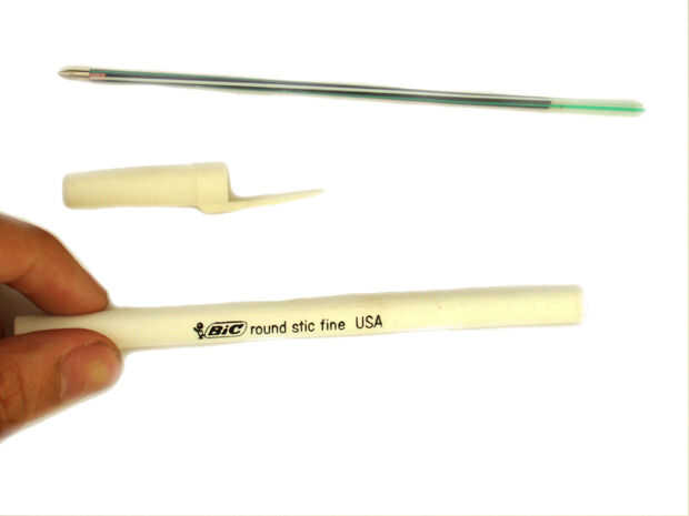 Conseguir un bolígrafo prefiere usar BIC porque su cuerpo es redondo y tiene un diámetro grande. Desmontar la pluma y luego tomar el cuerpo de la pluma que necesitará para su "cañón". Puede utilizar un lápiz más pequeño para disparar proyectiles más pequeños como semillas o balines.