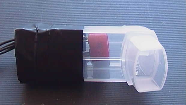 Tengo asma y los inhaladores son comunes en mi casa. Usé uno para caber en el sensor de MQ-3. Los inhalados asomando fuera de la caja de alcoholemia se ve fresco y profesional. Para fijar el sensor pegué los cables de la MQ-3 a la pared inhalada mediante cinta aislante. También mantiene sólo un extremo abierto para soplar en él y cierra el otro extremo con cinta aislante. Mi inhalador tiene un casquillo en el extremo de sopladores para que fácilmente puedo cerrar el extremo de sopladores
