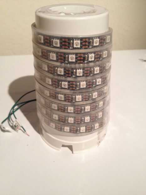 La tira de LED en un vaso de plástico y usar cinta de embalaje transparente para fijarla. Tapa la taza con un calcetín blanco; cortar a medida si es necesario. Esto difundirá la luz de los LEDs.