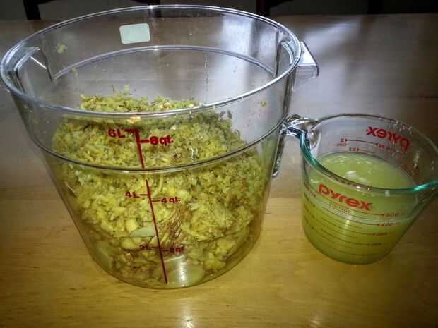 - Soltar el jengibre en un procesador de alimentos. Usé el disco de rallar. Tuve que limpiar hacia fuera dos veces porque tienen tapados los agujeros. El jengibre es muy fibroso. Si no tienes un procesador de alimentos kitchenaid, despedazar cualquier forma que sea conveniente.
