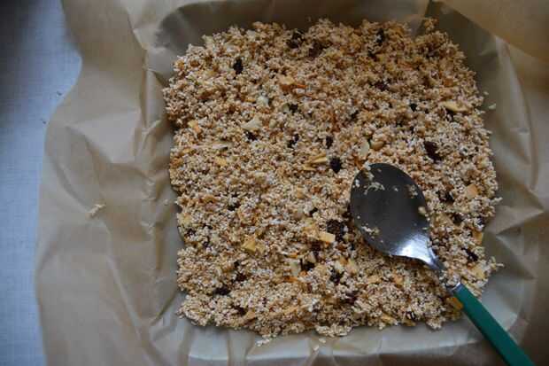 poner una hoja de papel sobre una bandeja plana de horno y esparcir la mezcla de amaranto y miel uniformemente sobre ella. Presione la mezcla un poco, para que la miel puede pegar los granos de amaranto juntos mejor.