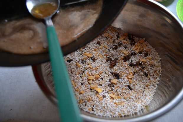 Verter la miel líquida sobre la mezcla de amaranto y mezclar bien.