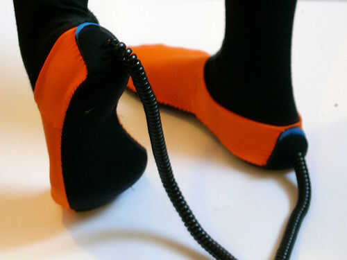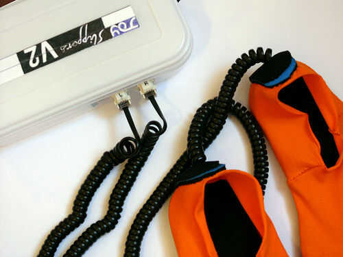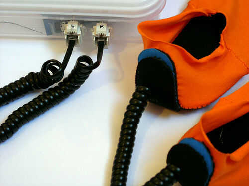 La gama de la resistencia de los sensores de presión depende mucho de la presión inicial. Idealmente usted tiene sobre la resistencia del ohmio de 2M entre dos contactos cuando el sensor está acostado. Pero esto puede variar, dependiendo de cómo se cose el sensor y la superposición de las superficies conductoras adyacentes qué tamaño tienen. Por esta razón elijo coser los contactos como puntadas diagonales de hilo conductor - para reducir al mínimo la superposición de superficie conductora. Con los sensores de la presión dentro de la JoySlippers, la presión inicial de usarlos simplemente trae la resistencia de 2 K ohmios y luego, cuando totalmente presionado por pie en el pie va hasta aproximadamente 200 ohm.