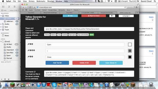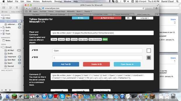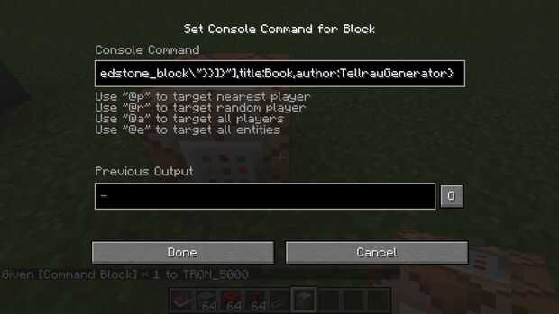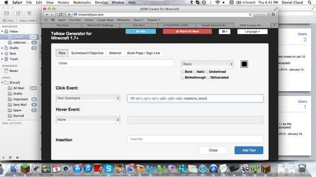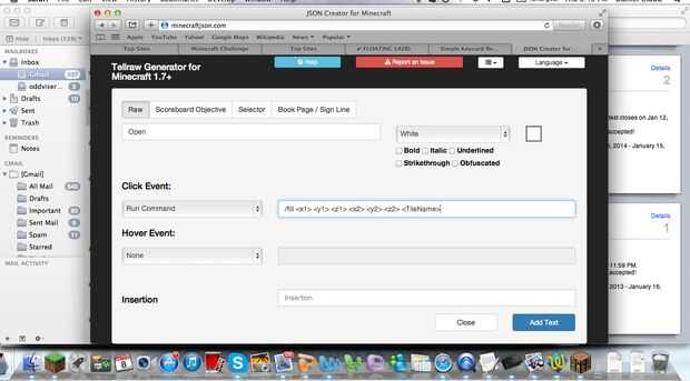 Vaya a este enlace y haga clic en libro en la parte superior, por defecto es tellraw que creo. De todos modos, haga clic en agregar texto y el texto, decir abierto, elija su color, entonces para el menú que dice haga clic en evento, desplegable elige orden de marcha, y el comando es /fill (x1) (y1) (z1) (x2) (y2) (z2) y entonces el bloque se está utilizando. Utilizar las coordenadas del paso anterior. Continuación, haga clic en agregar texto nuevo. A continuación, haga clic en agregar texto nuevo y poner en un espaciador de algún tipo, utiliza. Haga clic en agregar texto nuevo. Entonces, usted sabe lo que voy a decir, haga clic en añadir texto nuevo y cerrar en la barra de texto. luego elige tu color y en evento click, decir ejecutar comando y del comando poner /fill (x1) (y1) (z1) (x2) (y2) redstone_block (z2) utilizando las mismas coordenadas del paso anterior. Haga clic en agregar texto y luego desplácese hacia abajo para el código, copiar y luego pegar en un bloque de comandos en minecraft ponen una palanca sobre el bloque de comando, conseguir su libro y probarlo.