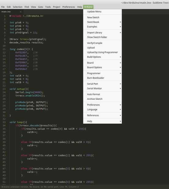 Si eres como yo y creo que el valor predeterminado IDE de Arduino es horrible, hay que empezar utilizando texto Sublime y Stino. Sublime Text es un editor de texto magnífico, elegante (descargar aquí: http://www.sublimetext.com/3). Stino es un plugin de Sublime Text que extiende su funcionalidad a Arduino. Con Stino, puede compilar y cargar proyectos, leer y escribir datos en serie y mucho, mucho más.