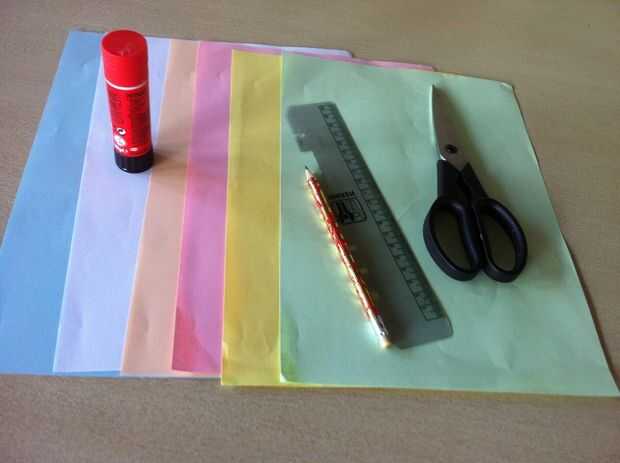Papel de colores A4 Tijeras Lápiz Regla (tengo la medida de cm en mi regla) Cinta Pegamento pegatinas (olvidó incluir en la foto) Algunos utilizan tarjetas de felicitación (se olvidó de incluir en la foto)