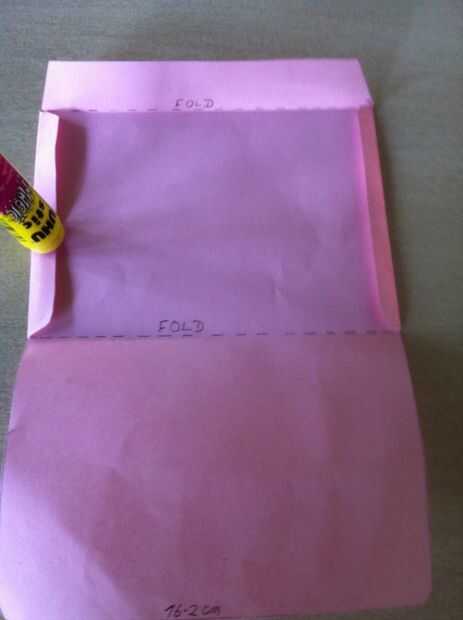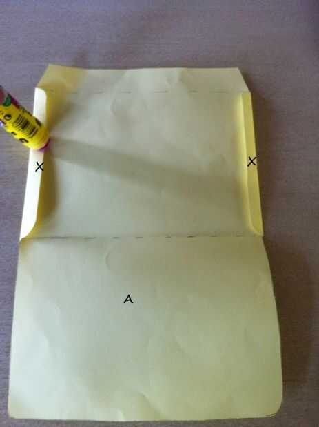 Doblar los dos lados marcados x hacia adentro y aplicar el pegamento. Ahora dobla la parte marcada hacia arriba y pegar a los lados pegados. Lo mismo se aplica a todos los otros sobres.
