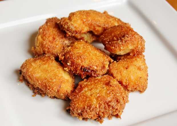 6. Desmoldar después de que ambos lados estén dorados. Es muy importante que usted deje que se enfríe el nuggets durante 5 minutos antes de comer. La capa es super frágil directamente fuera de la bandeja (porque hay huevo mantiene todos juntos), y que necesita tiempo para endurecer un poco a mantener mejor su forma.