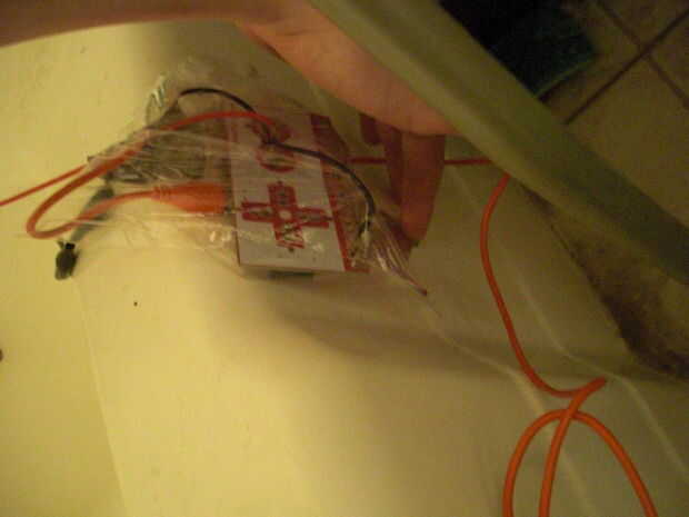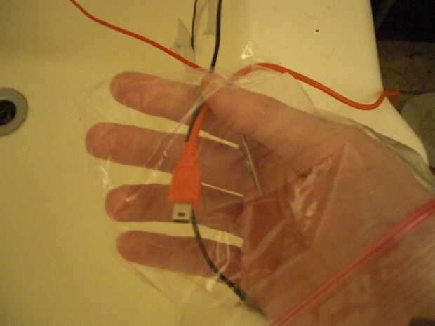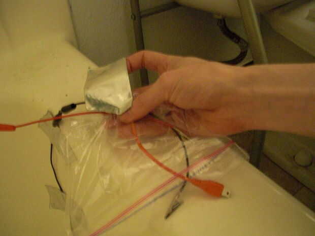 Enrolle cinta aislante alrededor del agujero para evitar que se rasgue alguna más grande (foto 4).  Tratar de sellar el agujero con agua mientras estás en él.