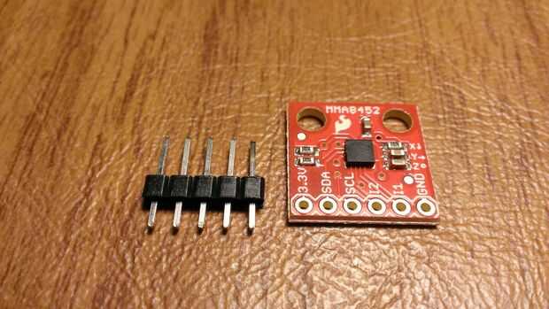 El acelerómetro de Sparkfun viene sin realmente estar conectado a nada. Necesitaremos unas pinzas de cabecera para que sea más fácil trabajar con la soldadura. En el cuadro incluido a ver una foto del acelerómetro y el pin de la cabecera. Porque es difícil mantener una cámara y un arma de la soldadura al mismo tiempo, fui capaz de incluir alguna fotografía de ese proceso. Si usted está confundido sobre cómo soldar, hay algunos excelentes instructables que tienen grandes efectos visuales.