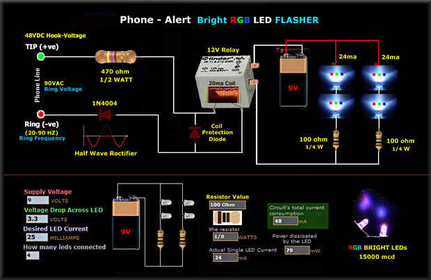 Esta repetición contacto ON-OFF del relé - alternadamente - hace que el circuito de 9V producir una respuesta de frecuencia de anillo rápido para proporcionar a un ma 24 corriente "quick flash" a cada una de las dos cadenas de LED RGB.