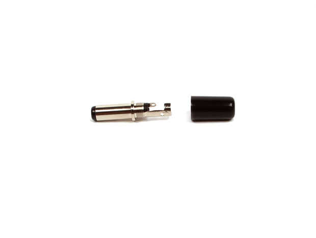 Suelde el cable rojo del cierre de la batería a la terminal de punta de la clavija y el alambre de vuelta a la terminal de barril.