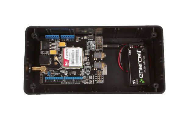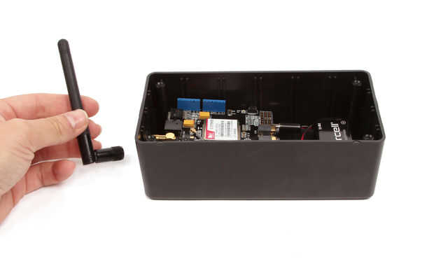 Se atornille la antena celular en el conector de oro en el lado izquierdo de la pantalla GPRS/GSM (marcado en la primera imagen arriba). Sin embargo, usted necesitará hacer un agujero en el recinto del proyecto a fin de que ajuste.