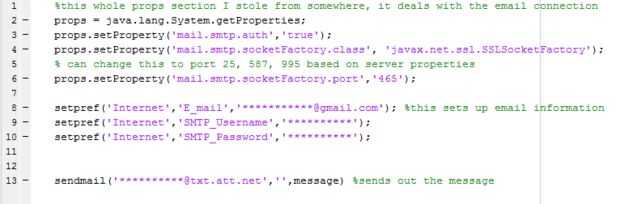 Hay un montón de ajustes y preferencias que deben establecerse para que la función sendmail trabajar. Sólo puedo comprobar que estos ajustes específicos de trabajo para gmail. Por favor, utilice una cuenta de correo electrónico no deseado, porque tienes que poner tu usuario y contraseña como texto simple en el código. También, cuando primero intenta enviar un correo electrónico con MATLAB, Google niega acceso a la cuenta, porque cree que MATLAB está tratando de hackear la cuenta. Google me envió un email diciéndome que bloquean la señal en intento y me dio la opción de deshacer mi configuración de seguridad. Aún otra razón para utilizar una cuenta de correo electrónico no deseado.