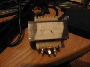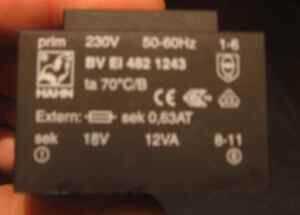 Encontramos 1 transformador con dos outs en la bobina secundaria de 18 voltios y una corriente de al menos 0,4 A. No tengo esto, y compré dos transformadores idénticos (USD 4) con salidas de 18 voltios y una corriente de 0,6 A (modelo BV EI 482 1243) alemán compañía Hahn, se muestra en la imagen.