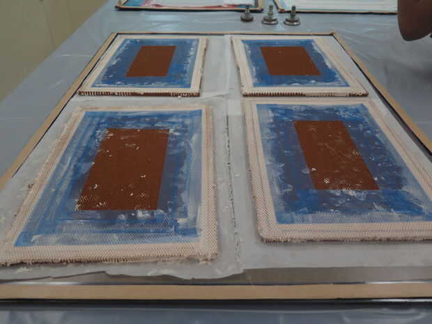 1. Corte individuales hojas de cáscara de poliester ply y en posición plana (muestra de la imagen esto ya está hecho. Está por debajo de la base de panal).