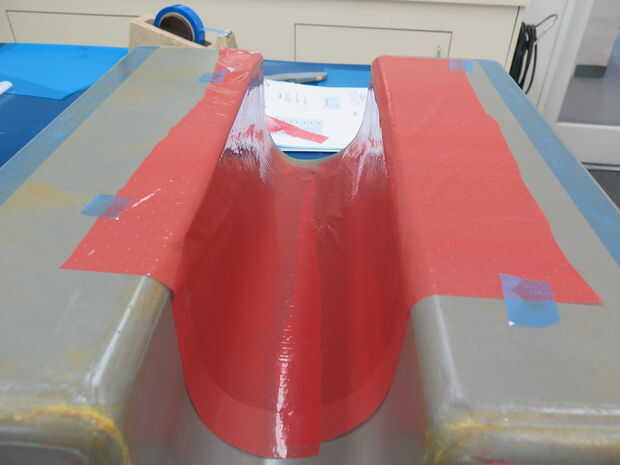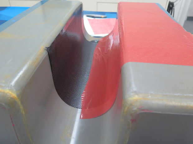 Aplicamos desmoldante al molde, por lo que las capas no se adhieren al molde. Hecho. A continuación, poner film separador perforado rojo encima de la primera capa de carbón. Esto tiene agujeros y permite que el aire fluya a la bomba de vacío. Tenga en cuenta que tengo dos pedazos de liberación rojo perforado con un traslapo de 0.5" en el centro. Esto permite que la película perforada de la liberación para moverse como se aplica la presión.