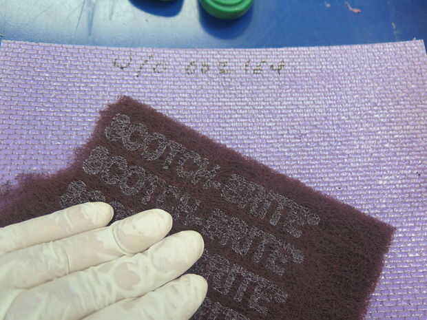 Preparar la base de panal con película adhesiva ligera abrasión película adhesiva con rojo Scotch Bright.