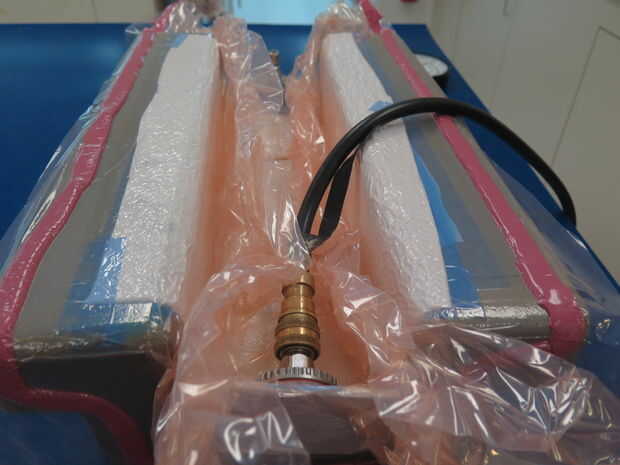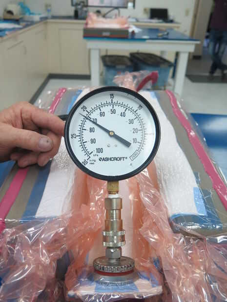 Hacer un vacío bolsa, inserte dos conectores a través de la bolsa y sacar vacío. Este bolso tiene dos puertos porque atrae a un puerto de vacío y el otro puerto se utiliza para monitoreo de presión. Revise si hay fugas usando un calibrador. La bolsa no puede tener fugas y debe tener vacío.