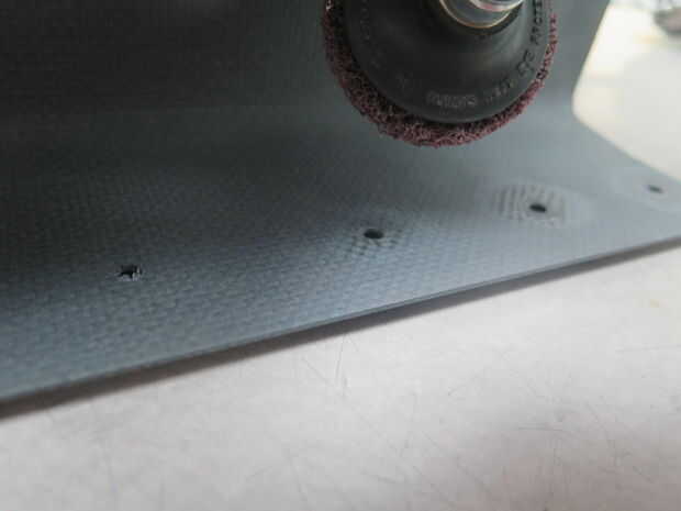 Preparación de la superficie del compuesto de pulir la resina con rojo Scotch Bright. Esto prepara la superficie para el pegamento.