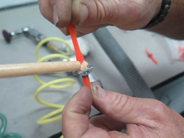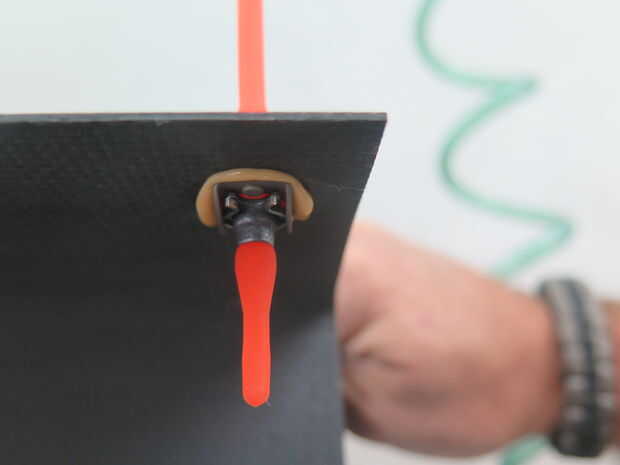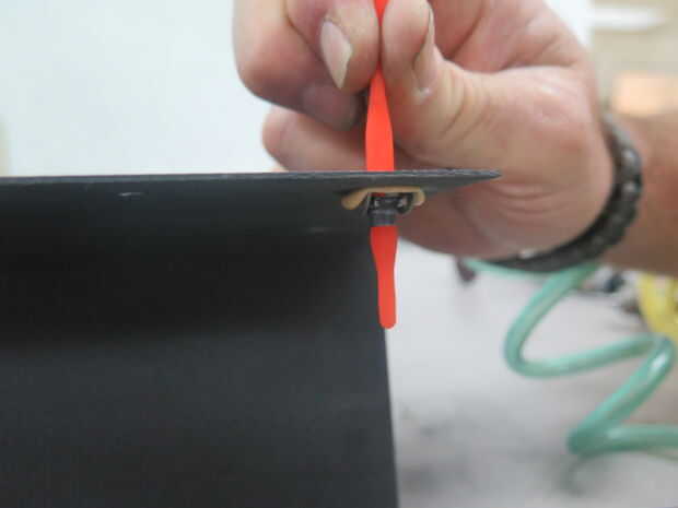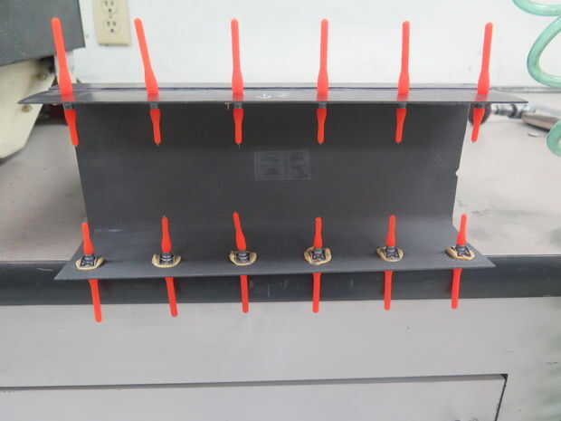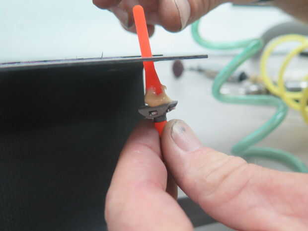 Usaremos algo llamado un nutplate. Específicamente, se trata de un #8 flotante nutplate. Aplique el adhesivo CB200 e inserte. Repita para todos los agujeros.