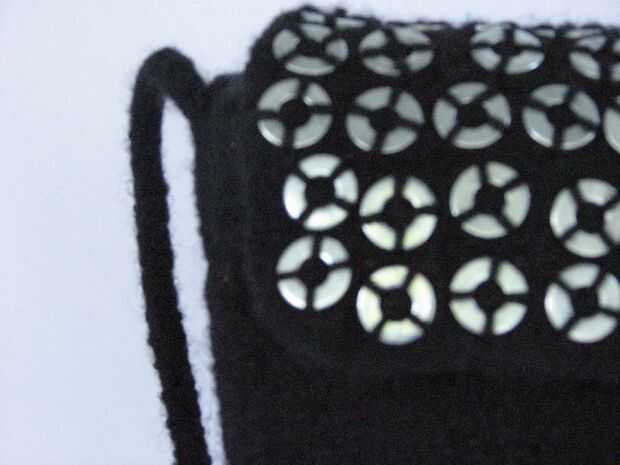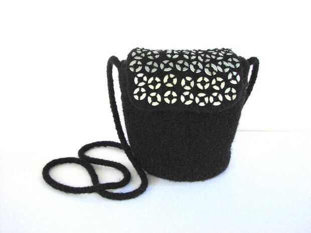 un encantador bolso de noche de tamaño las lanas de fieltro con tapa asegurada por un broche de imán. La correa del punto i-cable es fino y delicado, pero no debe ser confundida con cualquier bolso de noche. Esta joya, mientras que el femenino en la forma y el diseño, fue inspirada por un viaje a la tienda de hardware y características del metal arandelas bordadas en la solapa... seguro que será una pieza de conversación en cualquier evento. Una forma libre punto bolso compuesto de básicos para hacer punto circular y el León marca lana.