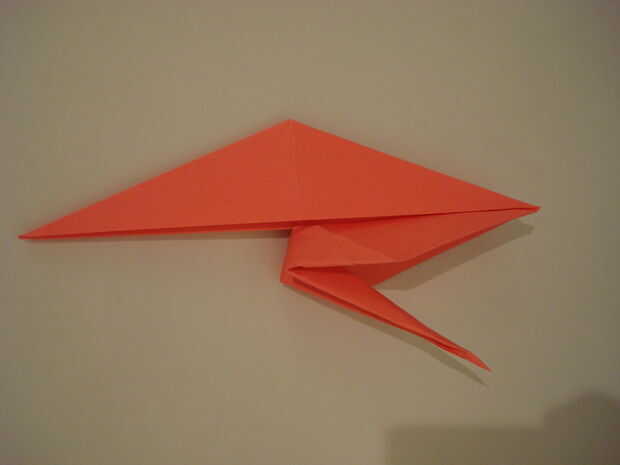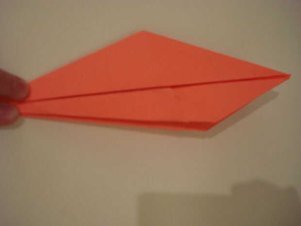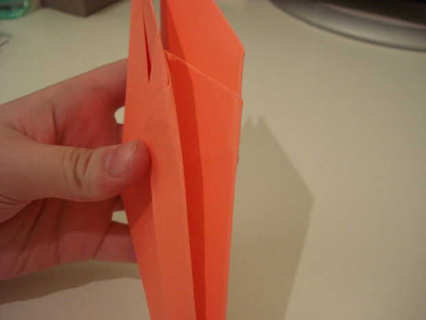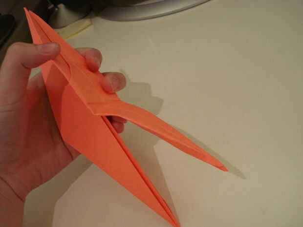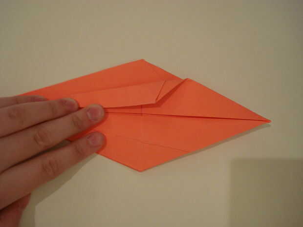 Ahora doblar la parte larga flaca que acaba de hacer. Doblar a lo largo de la línea media horizontal y al mismo tiempo, doblar el cuello en la mitad longitudinalmente, contrario de lo que era antes. Creo que esto se conoce como un interior invertir doblez (si eso ayuda). Áspero alinear el cuello a las capas anteriores de doblez.