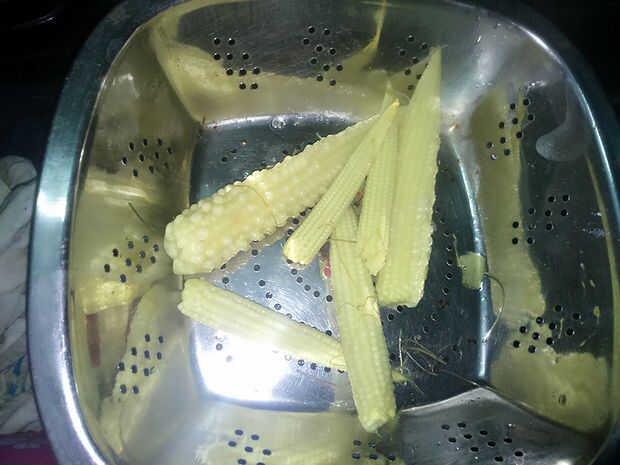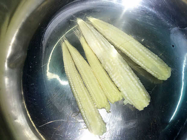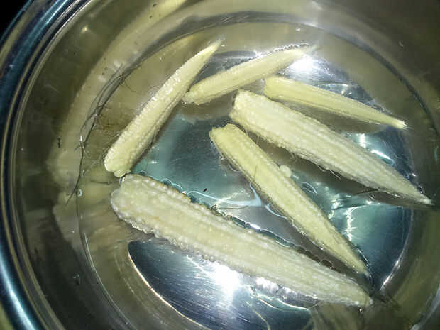 • Coloque los granos de bebé en un recipiente y agregue agua para cubrir el maíz