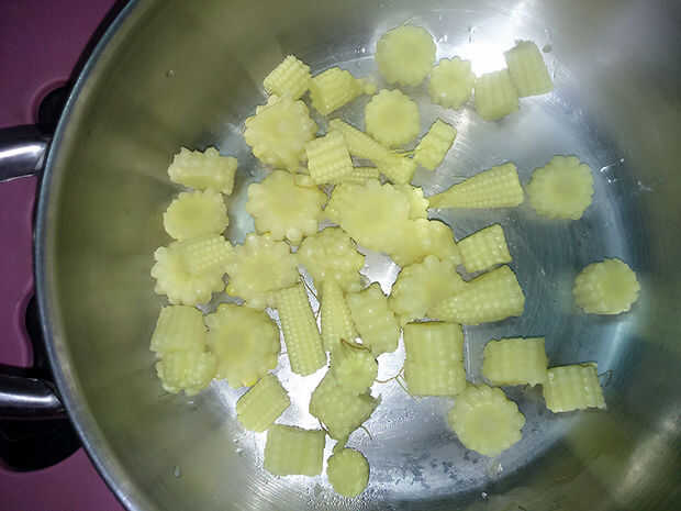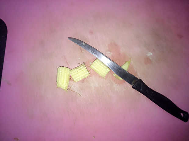 • Después de enfriar, cortar los granos de bebé en trozos pequeños con un cuchillo y guardar en otro recipiente