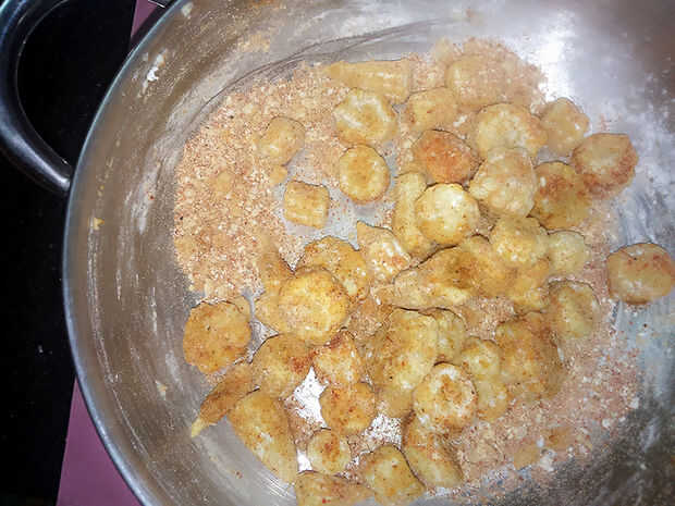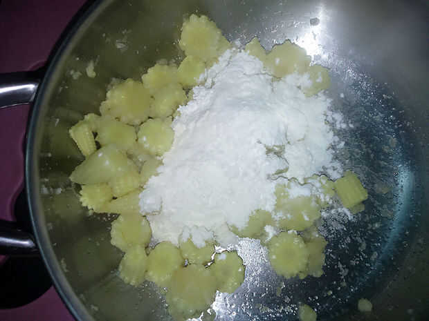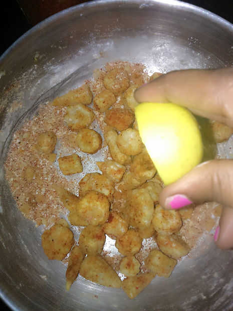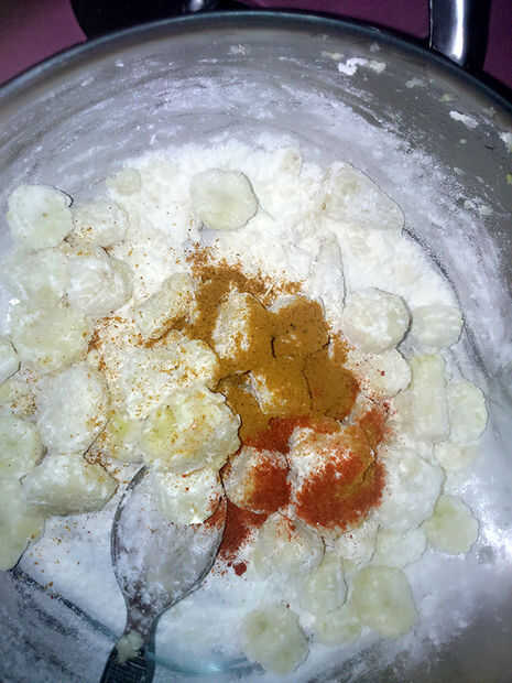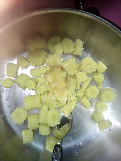 • Añadir pasta de Ginger Garlic a las piezas de maíz hervida y mezclar bien