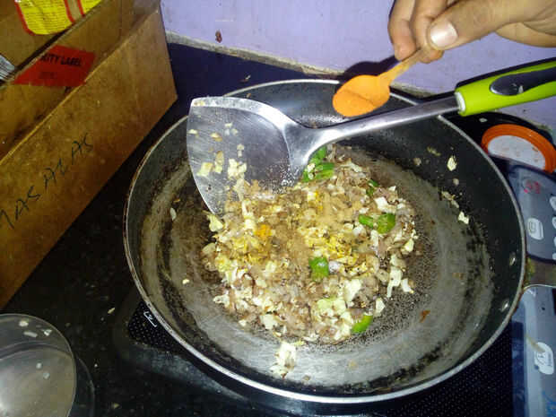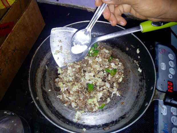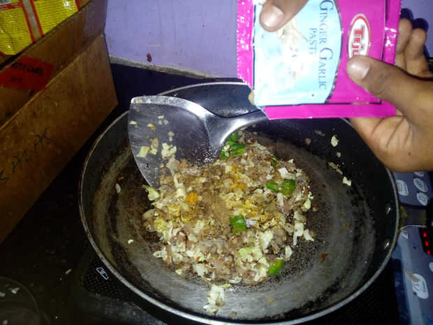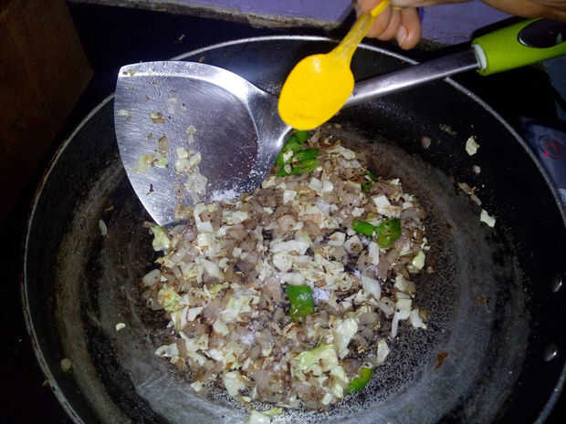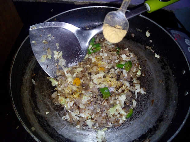 Poner sal, cúrcuma, polvo de cilantro, pasta de ajo jengibre y guindillas en polvo.