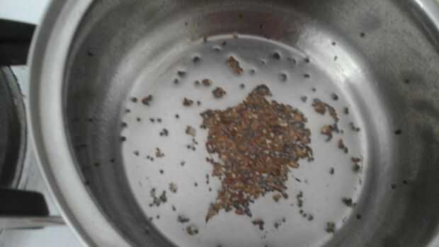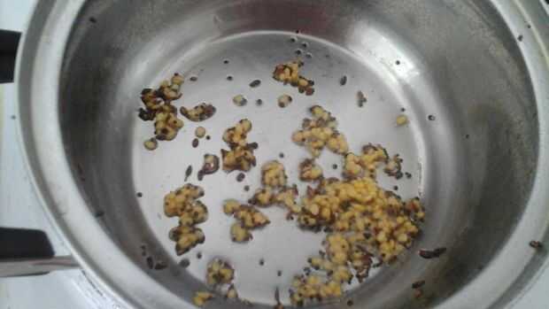 remojo moong dal (gramo verde) en poco de agua. Tomar un vaso y agregar algunas cucharadas de mesa de aceite. Añadir las semillas de mostaza y permitirles crujido. Añada semillas de comino y empapado moong dal y freír durante unos minutos.