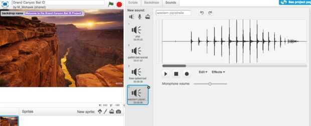 Haciendo una búsqueda en google con el nombre de su animal y .wav en el cuadro de búsqueda, puede encontrar una amplia selección de sonidos de animales. En mi caso, he querido grabaciones de frecuencia del sonar del murciélago, que no son perceptibles para el oído humano, pero que por suerte eran todavía accesibles. Una vez que usted guarde estos archivos en su ordenador, subirlas a cero. En el editor de cero, haga clic en la pestaña "Sonidos" y se pueden utilizar los botones allí después de subir su sonido para editarlo. Es útil sacar cualquier silencio al inicio y al final de su sonido, por lo que la respuesta es más inmediata al completar el circuito. Guardar sus ediciones, para que usted puede poner fácilmente en sus sonidos cuando hagas tu programa de Scratch. Scratch permite un paso que reproduce el sonido una vez, o que juega varias veces hasta que abra el circuito. Usted puede escoger cuál funciona para usted.