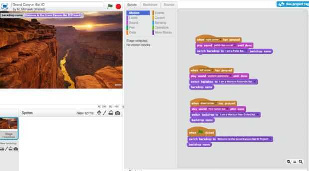 Jugar con cero es la mejor manera de sentirse cómodo con su funcionamiento. Configuración de los iconos diferentes para dar lugar a diferentes actuaciones le mostrará cómo usarlo incluso antes de conectar el MakeyMakey. En mi caso, puedo establecer unas rutinas diferentes, que se pueden ver en mi programa aquí. En primer lugar, creé declaraciones que permitieron las acciones: "cuando < ciertas > tecla, sonido de juego < ciertos murciélagos sonido > hasta que esté listo, interruptor antecedentes < imagen de bat > Fondo nombre de < nombre de bat >". Hacerlo de esta manera con archivos bien-nombrados le permite ver exactamente lo que sucederá con cada una de estas rutinas poco.