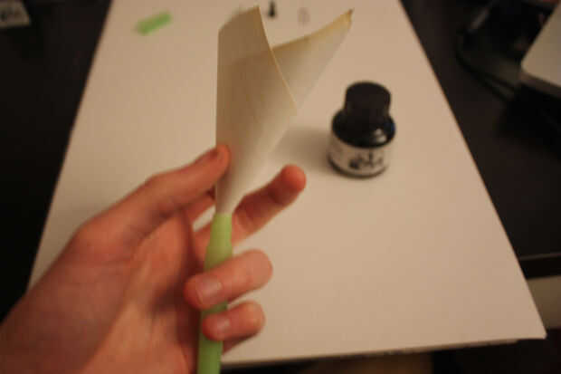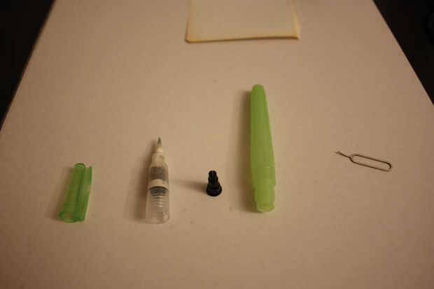 Desenroscar el bote de tinta luego enrollar el trozo de papel en un embudo y coloque en el extremo con una mano, use la otra mano para verter la tinta en el mango mantiene el ojo en qué tan rápido se llena. Retire el embudo, poner en bandeja.
