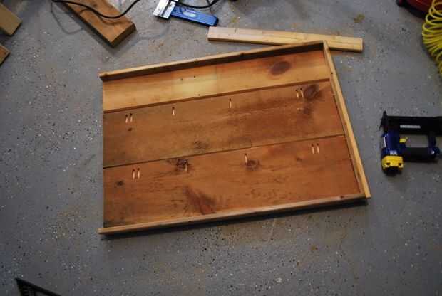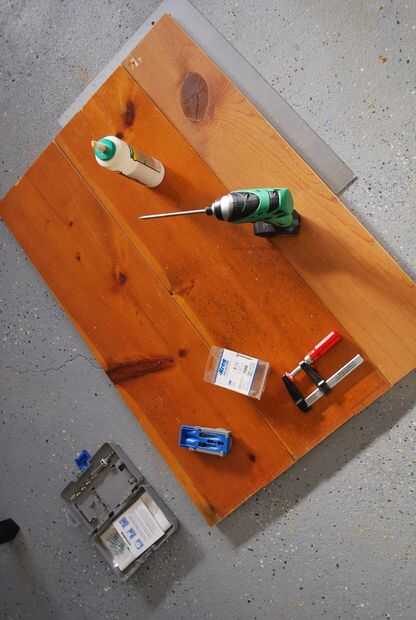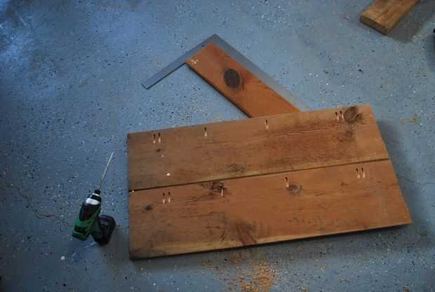 Usando tornillos de bolsillo y madera pegamento Fije los paneles de madera para la mesa.