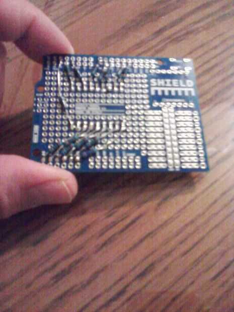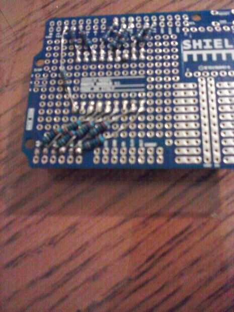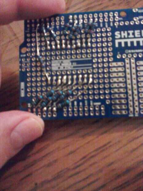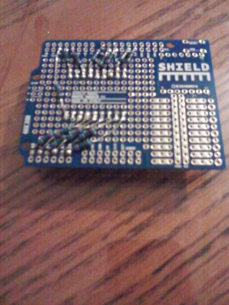 Después de instalar la pantalla alfanumérica, instalar las resistencias de 220 Ohm entre la pantalla alfanumérica y los pines marcados en el diagrama del proyecto. Nota que primero conecté las resistencias y luego los pernos a la interfaz a mi hardware de Arduino. Sin embargo, es mejor que primero Instale los pernos y luego las resistencias porque es más fácil para hacer todas las conexiones y soldar a los pines.