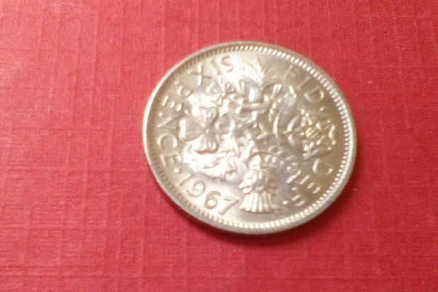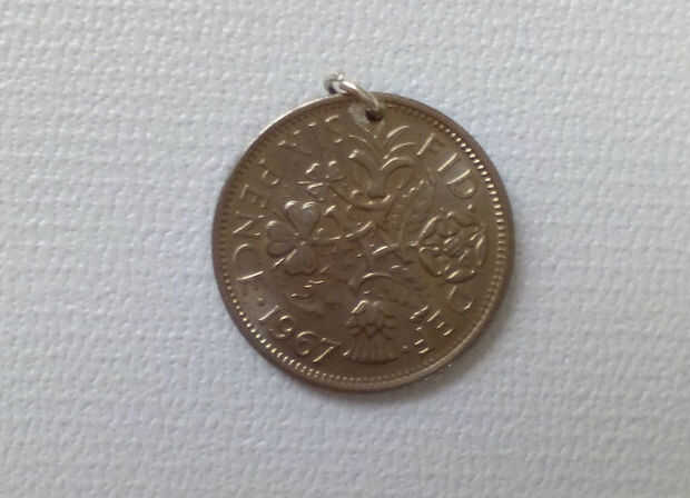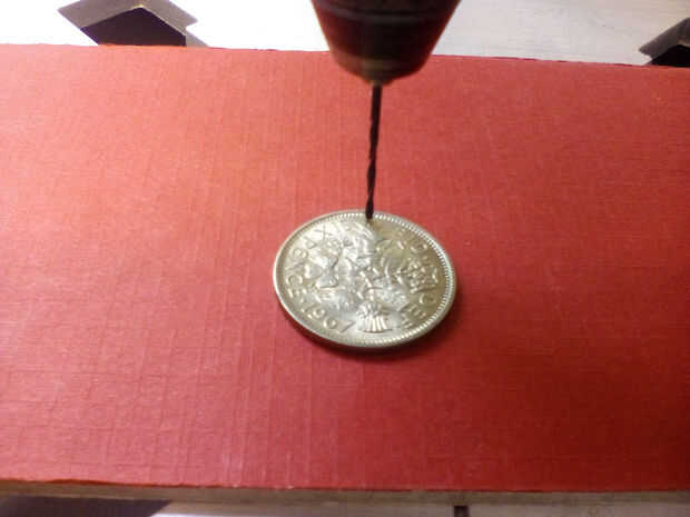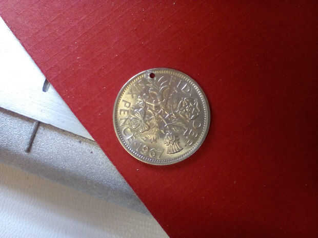Puede adjuntar el sixpence con una fianza si lo prefiere, pero preferí simplemente perforar un agujero en la mina - todavía se ve hermosa cuando está colgado del broche en un anillo de salto y cuelga 'hacia afuera', así de esta manera. Perfore un agujero pequeño, cerca pero no en el borde de una moneda. Puede utilizar taladro de una joyería o como lo hice, una herramienta tipo Dremel con una broca pequeña broca. Asegúrese de que sus anillas quepan por el orificio. 1mm es el más pequeño obtiene fácilmente la broca cerca de mí y se montar muy bien.