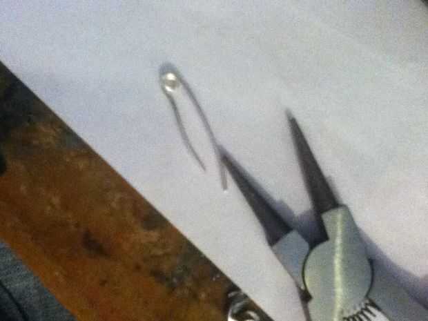 A continuación se que necesita doblar el alambre en la forma del perno de seguridad. La forma más sencilla que he encontrado para esto es agarre el centro del alambre con los alicates redondos de la nariz y cada lado alrededor de la curva al frente.