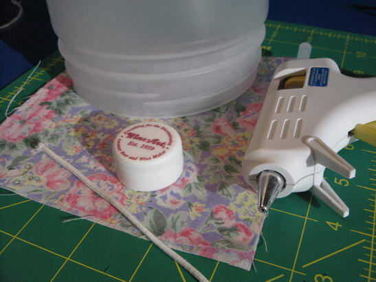Te necesita: martillo, clavo, pegamento de pistola, tapa de la botella de plástico, desperdicios de material, 4 1/2 pulgada placa/tarro/lo que sea para trazar un círculo, hilo y aguja y un trozo de elástico.