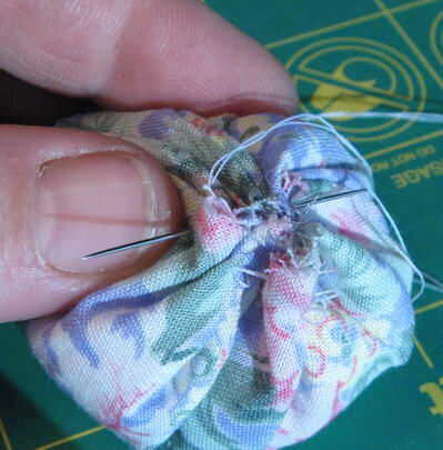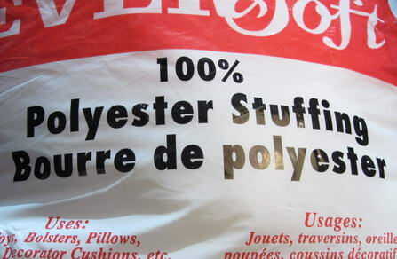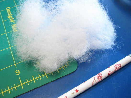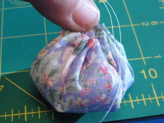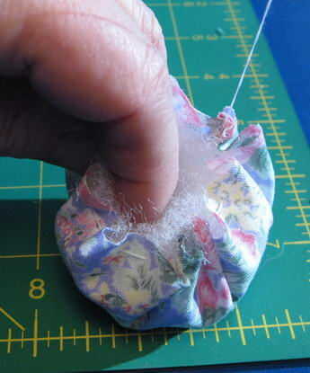 Agarrar algún relleno. Sucede que tiene una bolsa pero se pueden utilizar bolas de algodón, lana vieja, algunos por un animal de cosas, o incluso una almohada vieja. Tomar una cantidad razonable, (he puesto un lápiz en la imagen para que veáis cuánto.) Empuje en el centro tirando para arriba esas puntadas largas. No quieres atascado en apretado, lo suficiente como para "puff". Debe tener una bolita cuando termines. Ejecute su aguja para coser todo cerrado.