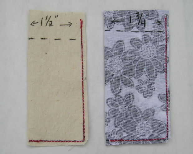 Después de coser en la línea sólida, ajuste a 1/4" o menos a lo largo de los lados y fondos. Recorte en la parte superior, justo arriba del tope de la línea de costura vertical.