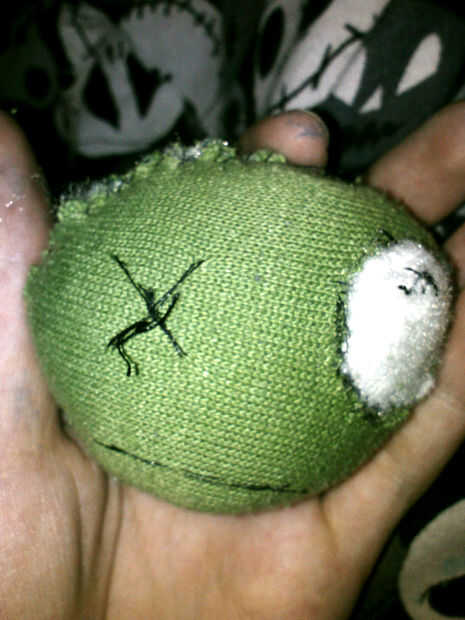 Coser la otra mitad de la cabeza a la primera mitad y gire derecha hacia fuera y mecharla. utilizar un montón de relleno. Si siente que usted ha utilizado tanto que la tela está a punto de rasgar utilizar más. C: también cuando usted está cosiendo juntos sugeriría dejando una abertura en la parte que va a poner su cerebro. Esto le permitirá cubrir cualquier costura desagradable.