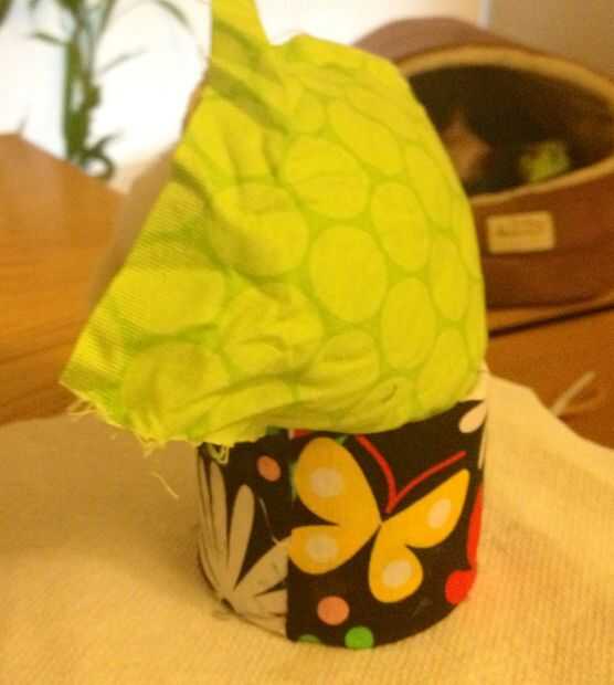 Y luego presione a la tela, por lo que se pega al lado y tiene a la tela de fibra de relleno para la parte interior del envase. Una mano debe apretar el relleno para que no peguen antes de tela, otra mano empuja la tela.