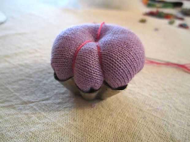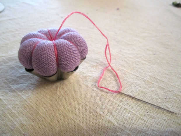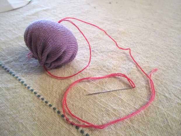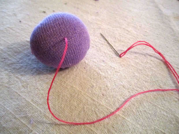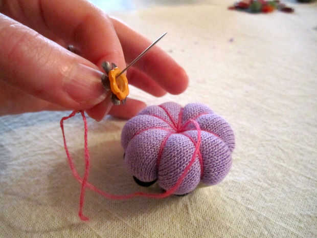 Tire del hilo a través del centro de tu poof y lazo alrededor.