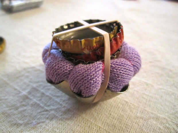 Pila de algunas tapas de botellas, monedas, u otro similar del artículo sobre la goma y el poof lo hasta que se seque.